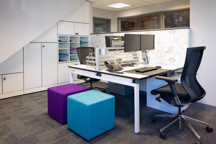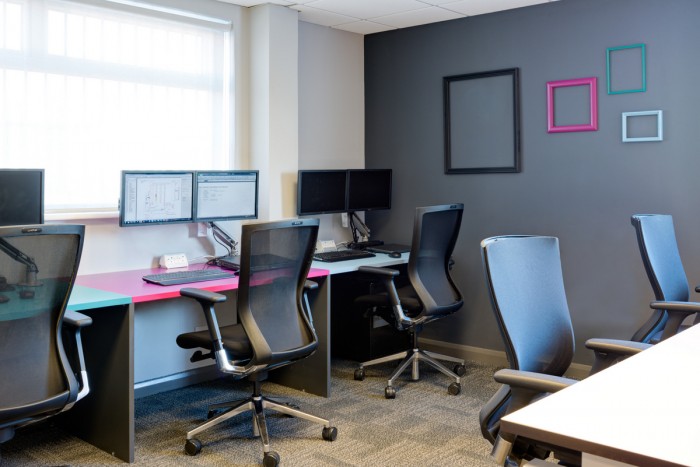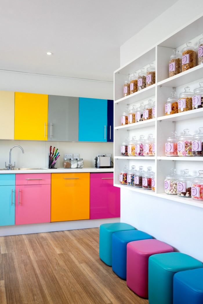 白色墻壁、深色地毯,會讓辦公區設計簡潔整齊,適度緊湊又相對開放,實用的同時實現了功能區的劃分。灰白的色調營造整體的辦公環境是沈靜的,而不同亮麗色彩的桌面交錯中洋溢活潑氣息,給工作環境帶來活力和朝氣。類似白、淺藍、玫紅等亮色的運用,壹貫的清爽基調讓精神放松而振奮。而白色的基調中,如彩虹般的亮麗櫥櫃、座椅整擺放,工作間隙的休息也被精心設計和安排,激發了員工的活力,彰顯對生活的熱愛。