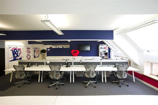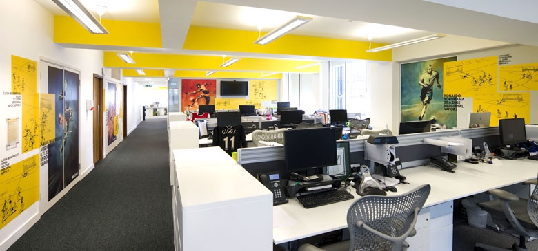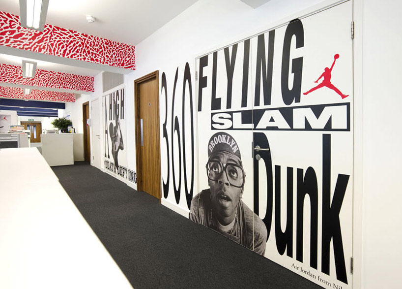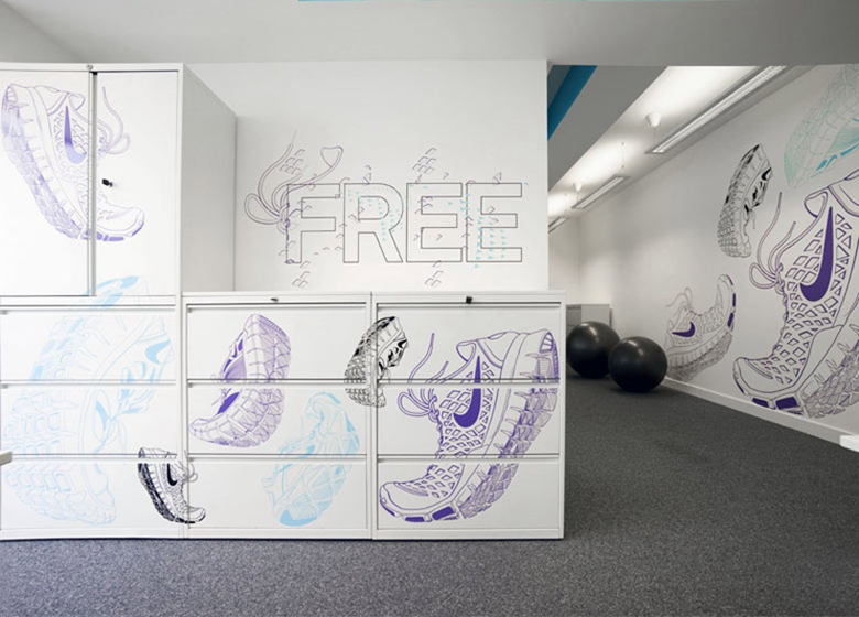 煥然一新的環境雖然在佈局方面未做太大調整,但在裝飾、品牌文化呈現上則更具創意與視覺震撼!Air Jordan、Air Max 180、Nike Mercurial等標誌性鞋款,FuelBand、倫敦地標,還有黑人導演Spike Lee飾演的Mars Blackmon等題材統統通過手繪、貼圖等形式呈現在牆面和落地玻璃之上,從而形成特色鮮明的主題區。儘管畫風、用色和主題都不盡相同,但卻依舊緊貼Nike、運動與倫敦三大主線,使原本乏味無趣的白色辦公區搖身一變成為激情四射的創意空間。