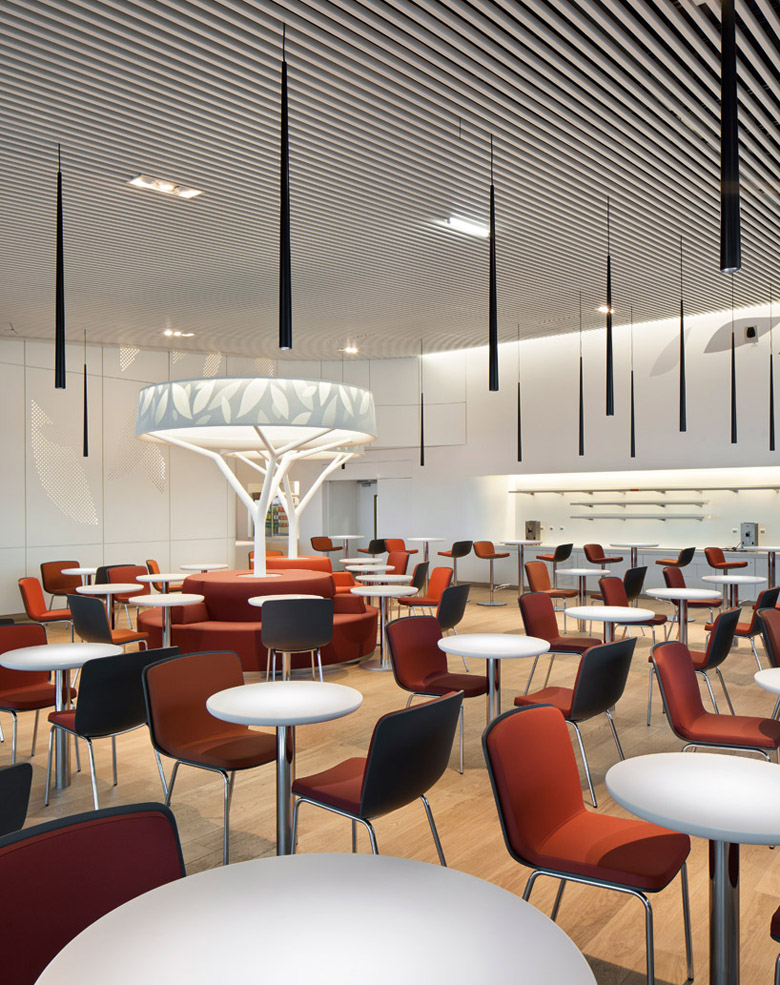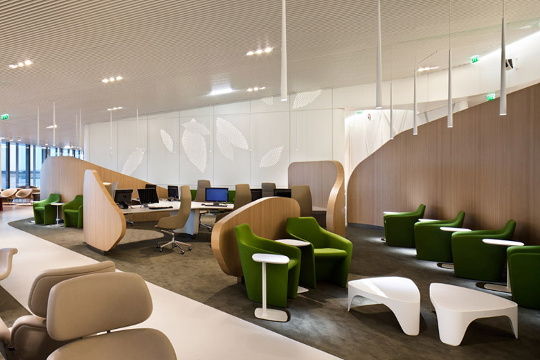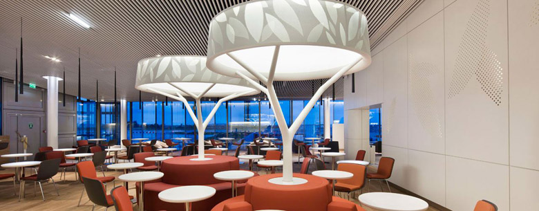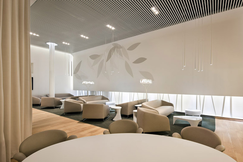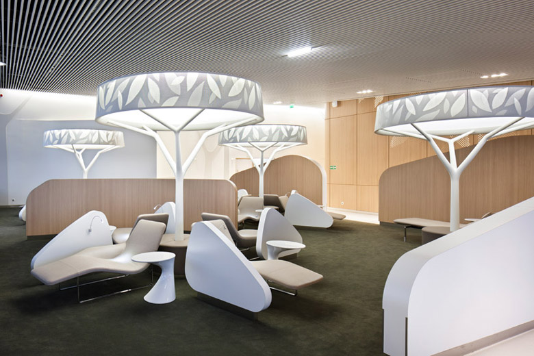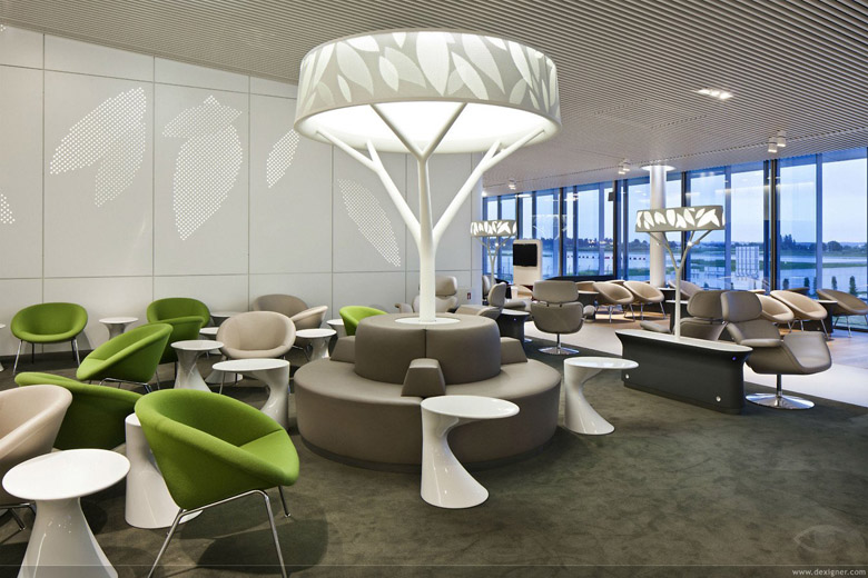从容时光,等待的美丽。在法航商务舱候机厅,设计师运用美丽的空间设计语言,打造出了温馨的等候空间。设计师以柔美的“树”的概念来契合美丽等候的主题,通过巧妙的设计让“树”的形象无处不在。虚实之间用简练的线条在墙面上勾勒出树木的形态,镂空的树叶图案,以及随处可见的错落有致的树形灯具,将空间装点得温暖而雅致,体现出大自然的无限魅力。