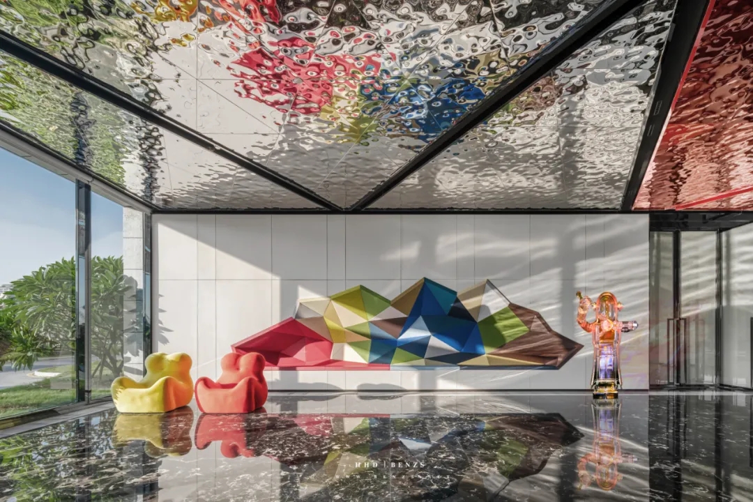 通过水波纹理和图形的设计,使空间而活跃,营造出一种空间平衡的美学。大堂接待区墙面的大型几何图为空间增添了视觉趣味,吸引到访者驻足欣赏。